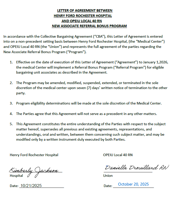The referral bonus agreement for Registered Nurses (RNs) with Henry Ford Hospital has been finalized today. After extensive discussions, they confirmed that no exceptions can be made to this policy. We are sharing the relevant documents to ensure everyone has the necessary information.