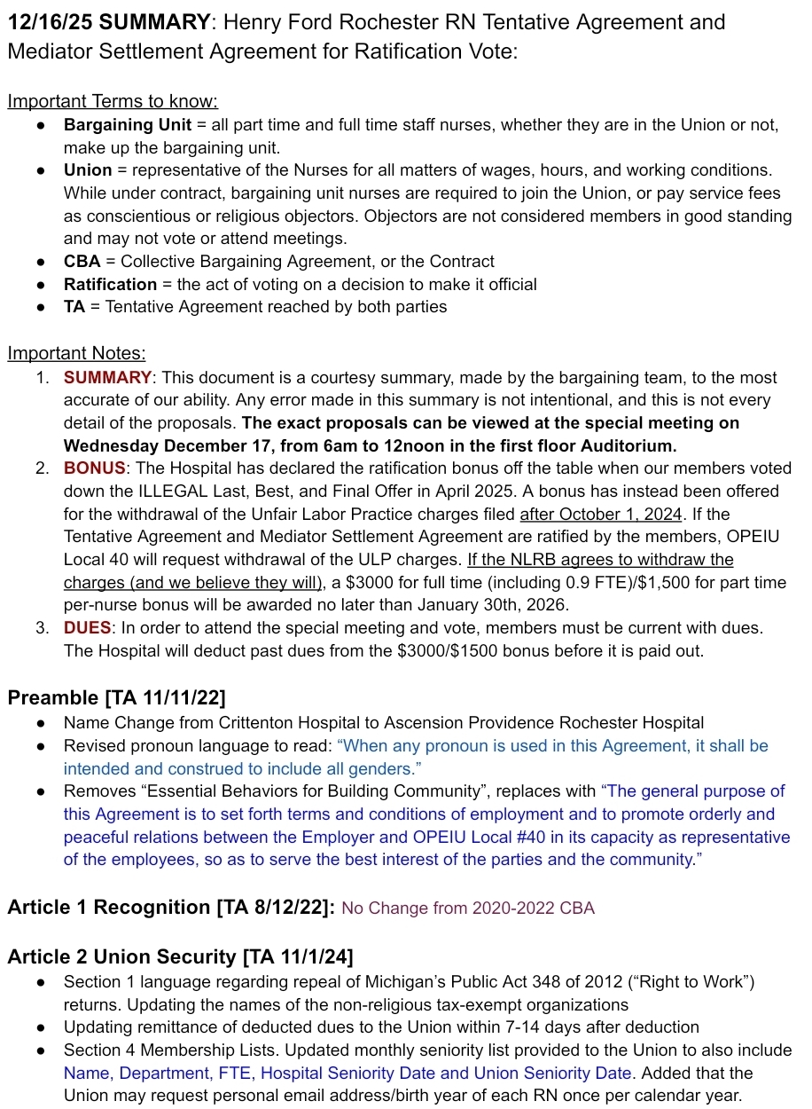 - WHAT: Membership vote to ratify the TA & Mediator Settlement